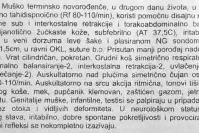 – Porođena žena T. V. (podaci poznati redakciji), koja se od kuće vratila s krvarenjem, a ležala je u C-bloku, koji se vodi kao infektivno odeljenje i odeljenje gde pacijenti umiru, gde su slali babicu S. M. (podaci poznati redakciji) da pazi tu ženu, a pre i posle toga u istoj noćnoj smeni je bila s porođenim ženama i bebama u kontaktu.